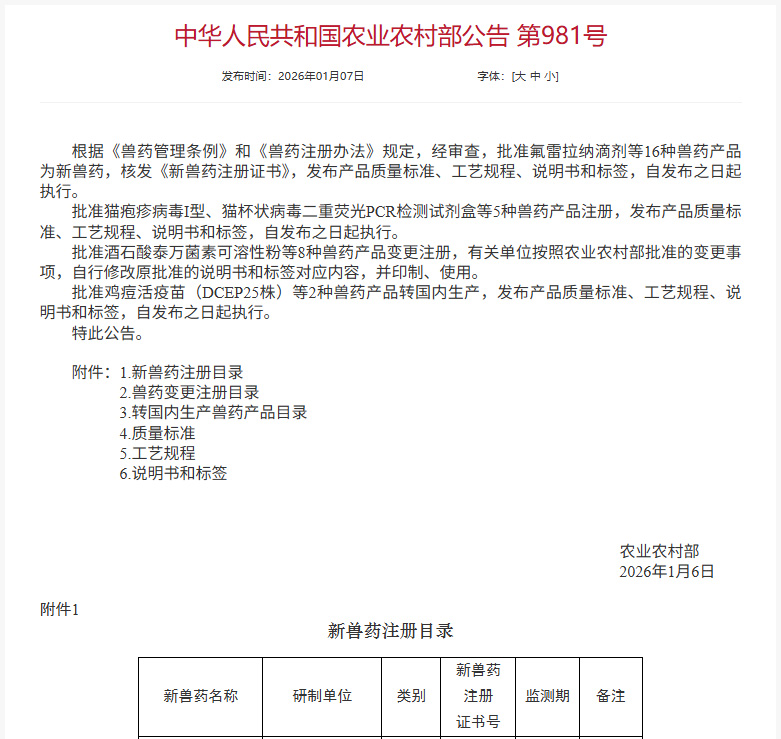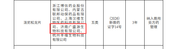 Recently, according to an announcement issued by the Ministry of Agriculture and Rural Affairs of the People's Republic of China on JAN.06, 2026, two new veterinary drug products co-developed by Jinan GSY Biotechnology Co., Ltd. have successfully passed approval. These include Category II new veterinary drug Fluralaner Chewable Tablets and Category V new veterinary drug Prednisolone Tablets. This marks a new breakthrough for the company in the fields of innovative R&D and clinical treatment for pet medications.